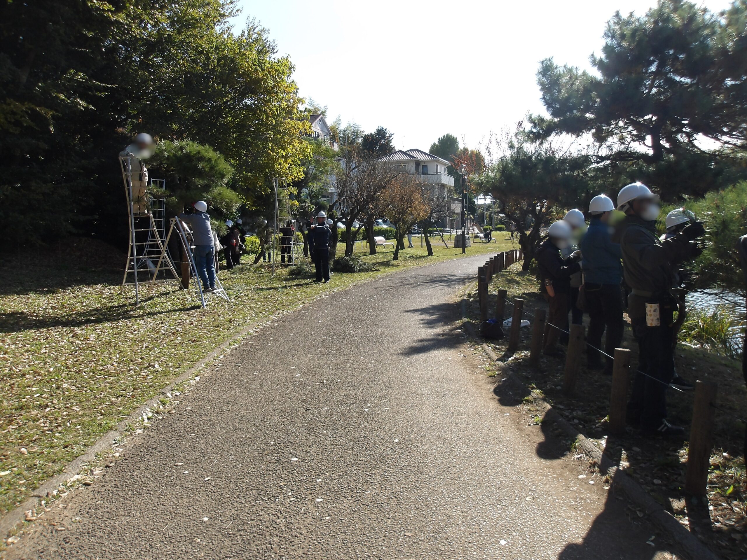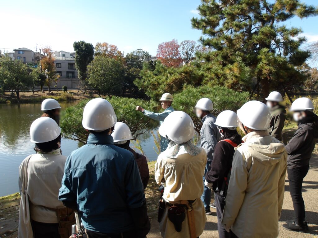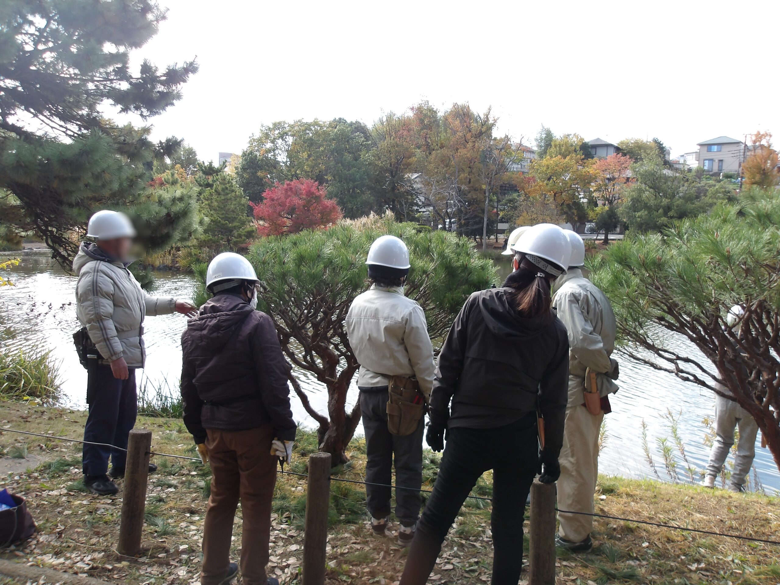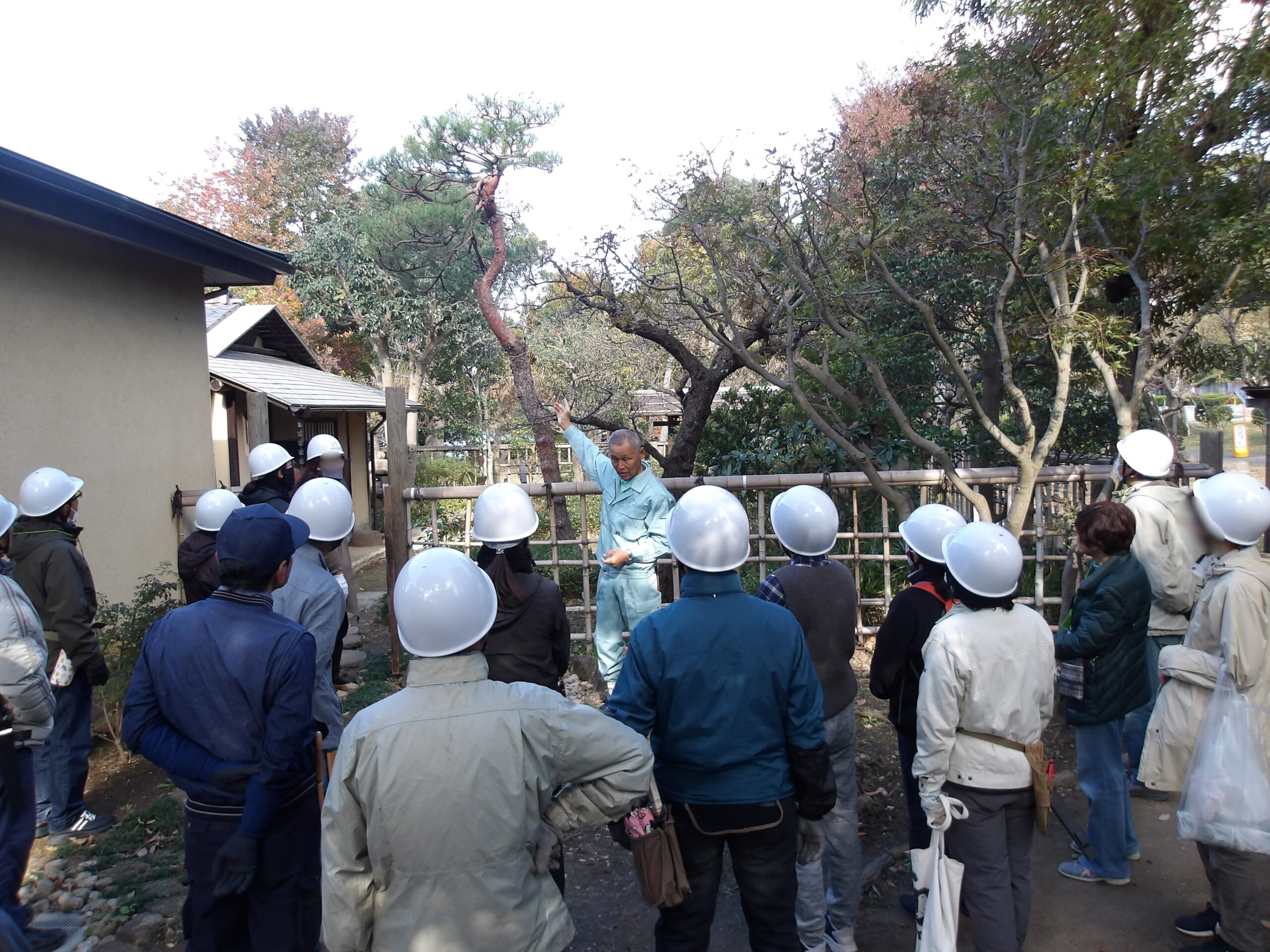 見学後に、園路沿いにある高木、低木の松の手入れを始めました。