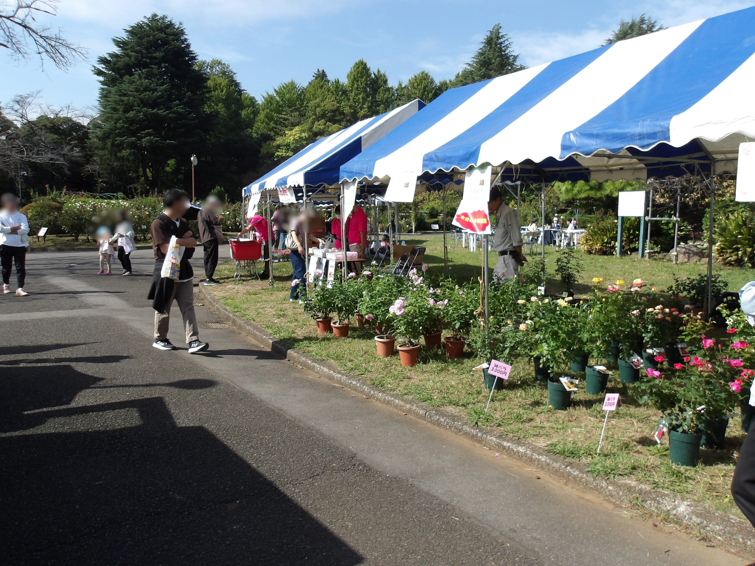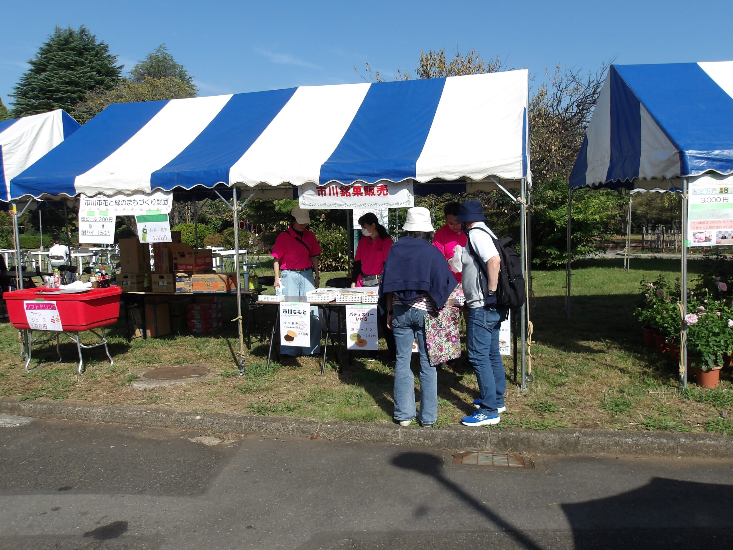 春のローズフェアと同じく、バラ苗、花苗、市川銘菓、飲み物などのお買い物をご来場の皆様に