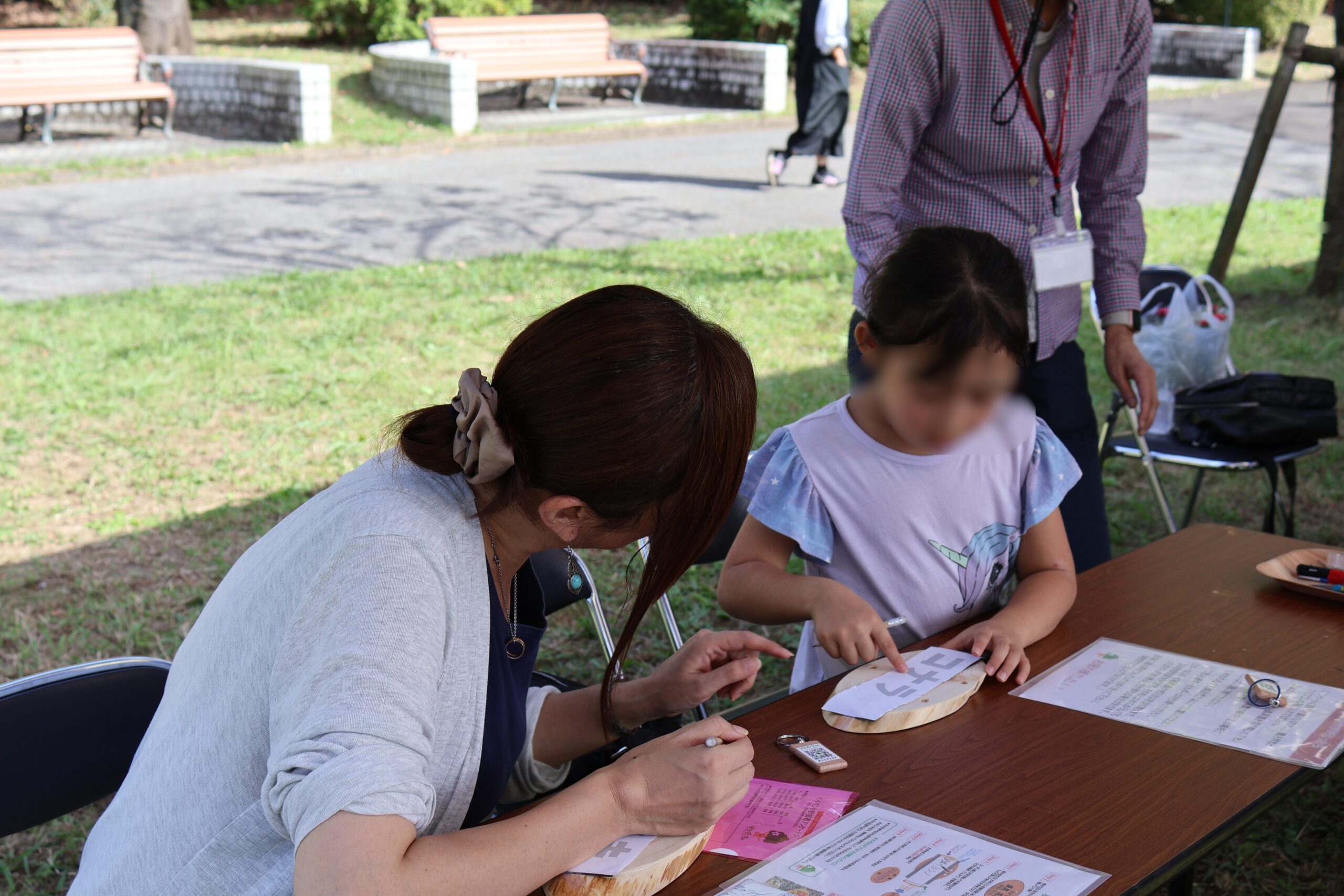 大きなヒノキの樹名板に好きな色のマジックや絵の具で描いていただきました。