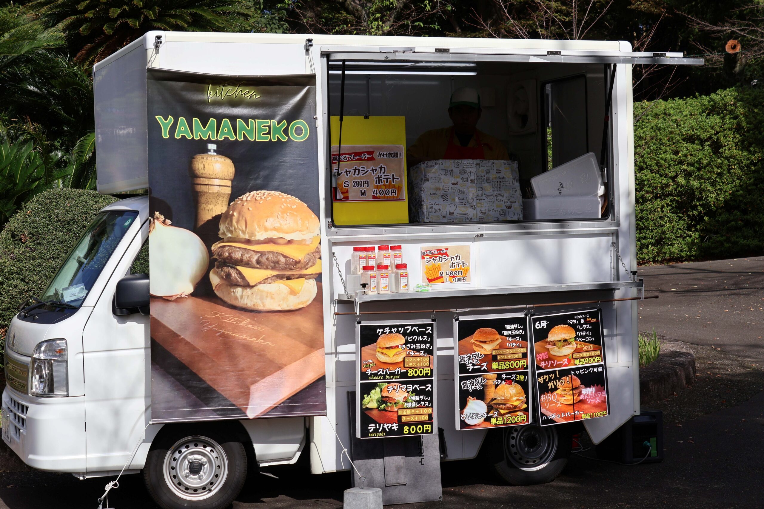 ボリューム満点のハンバーガーを販売していたヤマネコさん(左)、