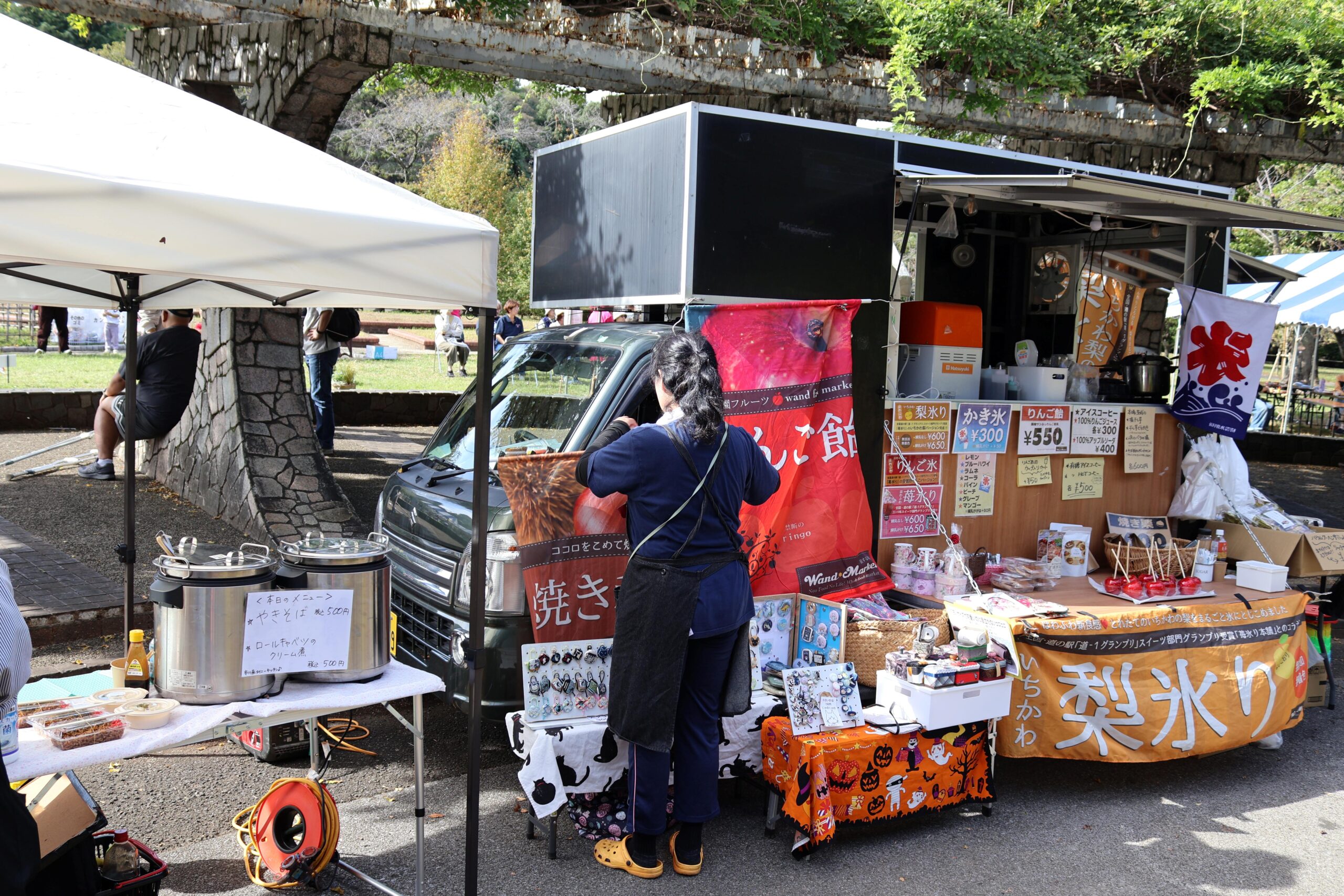 梨氷りやリンゴ飴などを様々な物を扱っていたワンドマーケットさん(左)、